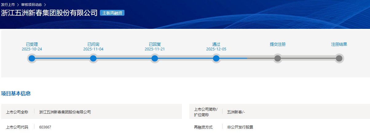 中国经济网北京12月7日电 上海证券交易所网站5日更新的审核项目审核显示,五洲新春(603667.sh)的审核状态不属于公开发行股票,已通过。五洲新泉10月27日披露的2025年特定对象股票发行招股说明书(申请稿)显示,本次特定对象股票发行募集资金总额不超过10亿元(含本金)。扣除发行费用后,募集资金拟投资以下项目:实体智能机器人及智能驾驶汽车关键零部件研发及产业化项目,以及补充流动资金。本次向特定对象发行A股的对象为不超过35名特定投资者(含原人数),发行对象范围为证券投资管理公司、证券公司、信托公司、财务公司、保险机构投资者、合格境外机构投资者(包括上述投资者的自营账户或管理投资产品账户)、其他合格境内法人投资者以及自然人或其他合格投资者。按照中国证监会的规定执行。证券投资基金管理公司、证券公司、合格机构投资者、合格境外人民币机构投资者认购其管理的两种及以上产品的,视为标的发行;作为发行对象的信托公司可以用自有资金认购。所有目标发行均认购按特定现金目标发行的股份。 A股向特定对象发行采用竞价方式。定价基准日为公司发行期首日。发行价不得低于定价基准日前20个交易日股票交易均价的80%(定价基准日前20个交易日股票交易均价=定价基准日前20个交易日股票交易总额)。本次发行的股份数量为募集资金总额除以发行价格。计算公式为:该事项本次发行股数=本次募集资金总额/每股发行价格(忽略小数位),且不超过本次发行前公司总股本的30%,即不超过109,860,831股(含质数)。最终发行量上限以中国证监会批准的发行量上限为准。本次发行标的认购的股份六个月内不得转让自发行完成之日起计算。发行对象尚未确定,因此无法确定发行对象与公司之间的关系。最终,本次发行是否因关联方认购本次发行的A股股份而构成关联交易,将在发行完成后公告的《发行报告》中披露。截至2025年6月末,公司控股股东张峰直接持有公司19.00%的股份;实际控制人张峰、余跃雷直接持有公司3.95%的股份。张峰、余跃雷通过五洲控股、阿行格致间接控制公司7.69%的股份。张峰、余跃雷直接、间接控制公司30.64%的股东,为公司实际控制人。实际控制人一致行动人王学勇持有公司7.15%的股份。实际控制人a其一致行动人合计持有公司股份37.79%。按照特定对象释放数量上限计算,特定对象释放完成后,实际控制人及其一致行动人仍担任实际控制人。本次发布的某些事项不会导致公司控制权发生变化。五洲新年发行的保荐机构为中信证券股份有限公司,保荐代表人为郑天宇、杨帆。